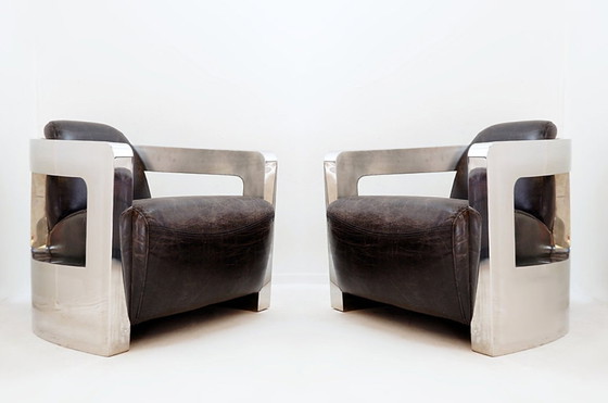 Stap in een wereld van moderne luxe met dit prachtige paar "Mars" fauteuils van Timothy Oulton, vervaardigd in 2009. Deze fauteuils combineren meesterlijk bruin leer en strak zilverkleurig metaal, wat resulteert in een gedurfde, sculpturale vorm die de aandacht trekt in elke verfijnde omgeving. Exquise vakmanschap combineert luxueus leer en strak metaal voor een harmonieus ontwerp. Een kenmerkend ontwerp van Timothy Oulton, bekend om zijn eigentijdse elegantie en gedurfde esthetiek. Perfect om een vleugje moderne luxe aan uw leefruimte toe te voegen, deze fauteuils zijn zowel stijlvol als comfortabel.