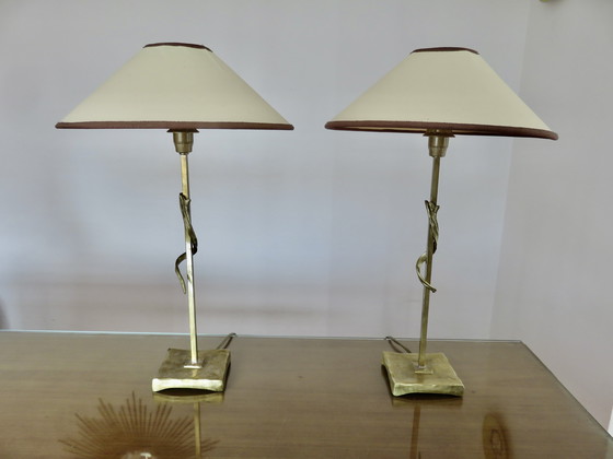 Paar lampen in de stijl van "Fondica" Frankrijk, jaren 1970. Ze zijn van verguld messing. De kappen zijn er alleen als model omdat ze beschadigd zijn en worden niet bij de lampen geleverd. Hoogte 39cm zonder kap (46cm met). Voet 10cm x 9.5cm. Kleine E14 schroeflamphouder. In uitstekende staat.