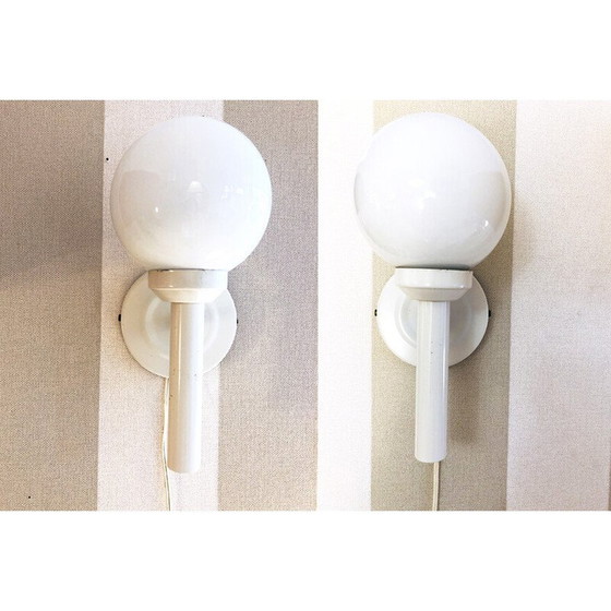 Paar vintage wandlampen van abo randers uit de jaren 70. Structuur van gebroken wit gelakt metaal en ondoorzichtige witte glazen bol. Snoerschakelaar (een uiteinde van een van de snoeren ontbreekt). Goede staat, wat slijtage, zie foto's. Etiket binnenin.