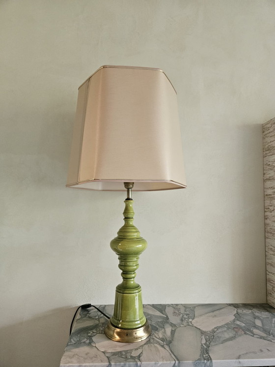 Een paar limoengroene vintage lampen in keramiek met hexagonen lampenkap in nudekleurige stof en messing trimming; Lichte slijtage eigen aan de vintage item. Nieuw bedrading. werkt perfect. E27 fitting. afmetingen lampenvoet 16cm doorsnee x 60cm H. Kap is 38cm H x 40cm doorsnee