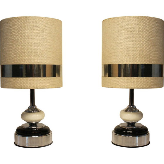 Paar lampen in beige en zwart gelakt hout en verchroomd metaal ontworpen door Jean Disderot. De lampenkappen met ongebleekt linnen effect, aan de buiten- en binnenkant afgewerkt met aluminium sierlijsten, nemen de Space Age-look volledig over. Dit paar vintage lampen is zeer decoratief en biedt een zacht en warm licht, perfect als leeslamp in een slaapkamer of in de woonkamer.
