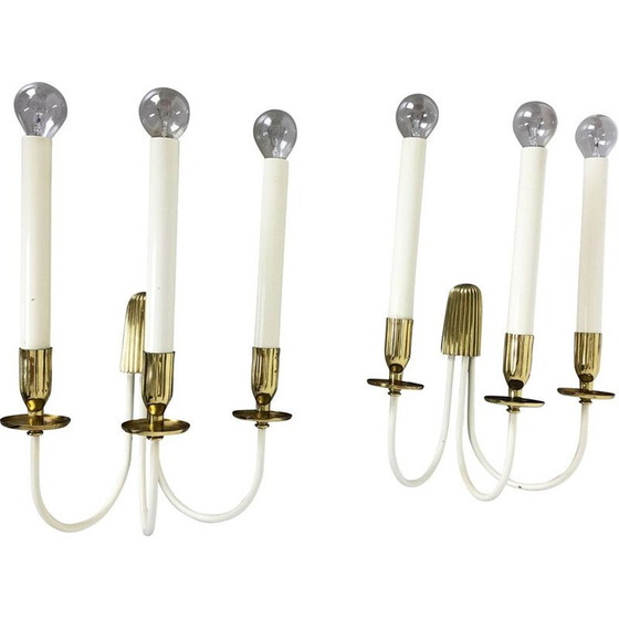 Deze originele mid-century wandlamp werd in de jaren 1950 in Duitsland geproduceerd door Vereinigte Werkstätten München. Deze hoogwaardige Duitse productie is gemaakt van messing en wit gelakt metaal. Elk armatuur heeft 3 geluste armen van wit gelakt metaal en witte metalen buizen bovenop. Bovenop deze buizen heeft de lamp fittingen voor 14 gloeilampen. Dit aanbod bevat twee identieke armaturen uit dezelfde modelserie. Een eenvoudig, minimalistisch jaren 1950 ontwerp. Dit item is een prachtige aanvulling voor elk modern huis. De lampen hebben een mooie hoogte van 37 cm.Afmetingen:Hoogte 37 cmLengte 26,5 cmDiepte 17 cmConditie:Dit item is in goede vintage staat met leeftijdsgebonden patina op het messing. Er ontbreken een paar lakvlekken op de buizen, één lamp heeft op één buis meerdere lakvlekken aan de achterkant, die niet zichtbaar zijn als ze aan de muur hangen.
