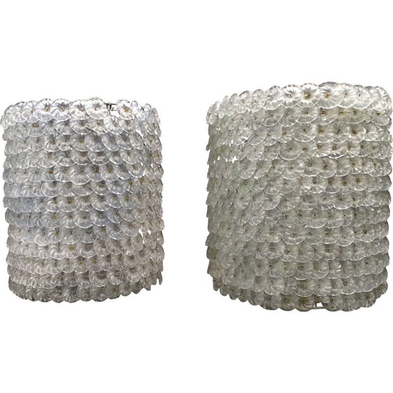 Een prachtig paar wandlampen met een verfijnd design gebaseerd op transparante bloemmotieven, een concave vorm en een metalen structuur. Perfect voor het verlichten van een hal of entree, ze geven elke kamer een verfijnde touch. Ze hebben een klein defect, één van de kleine bloemetjes ontbreekt. Als je van interieurdesign en decoratie houdt, mis deze dan niet!