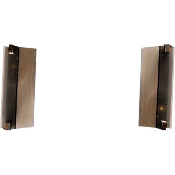 Duo van Italiaanse wandlampen, gemaakt van witte ondoorzichtige en doorschijnende taupe glasplaten met chromen montage.