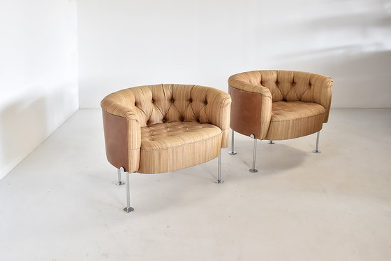 Paar vroege "310" clubfauteuils van Trix en Robert Haussmann voor Swiss Design Collection, Zwitserland, jaren 1960. In zeldzame streepstof gecombineerd met lederen bekleding.