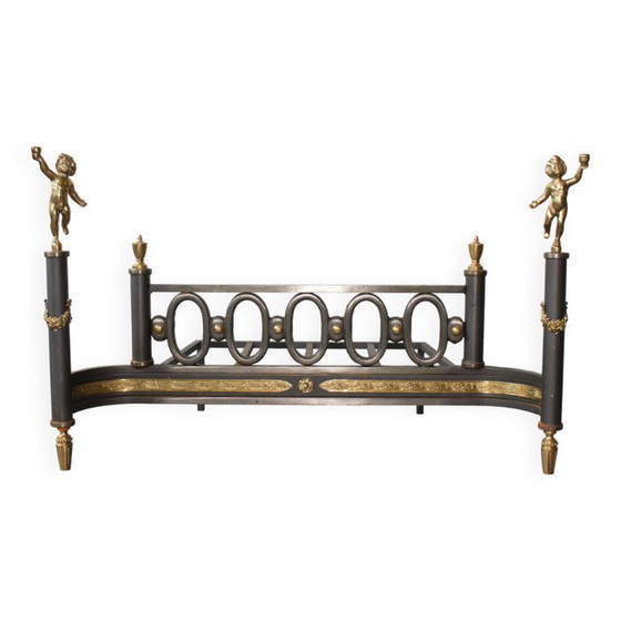 Stel haardbokken met houtblokkenbeschermers, van gepatineerd gietijzer en verguld brons. De haardbokken ondersteunen de houtblokken in de haard, wat zorgt voor een betere luchtcirculatie en dus een efficiëntere verbranding. Het houtblokkenbeschermer voorkomt dat het hout uit de haard rolt. Elke staander is versierd met een putto met een fakkel, gezeten op een zuil versierd met reliëfguirlandes. De gebogen gevel is versierd met een fries met krulwerk en een centraal medaillon, dat een rooster met ovale ringen en vergulde ballen ondersteunt. De taps toelopende poten en kleine vazen bovenop de staanders maken het geheel compleet. Dit object is zowel functioneel als decoratief, typisch voor neoklassieke en empirestijlen, maar brengt zeker tijdloze elegantie in alle soorten haarden. Wij bieden bezorgservice in België (€50), Parijs (€69) en Hauts-de-France (€69). Houd er rekening mee dat er een toeslag van €20 kan gelden voor leveringen naar hogere verdiepingen. Neem gerust contact met ons op.