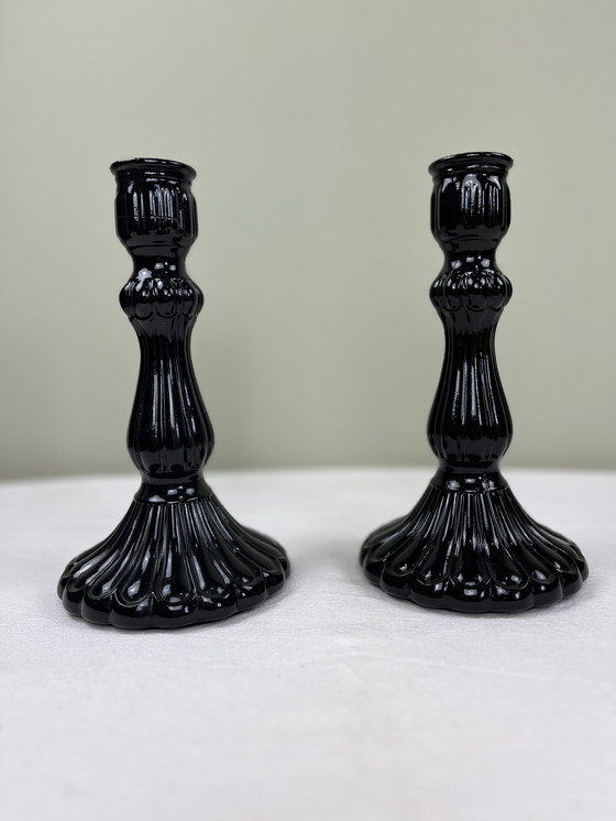 Voeg een vleugje tijdloze elegantie toe aan uw ruimte met dit zeldzame paar vintage kandelaars van zwart opaalglas. Met een hoogte van 23 cm zijn deze chique decoratieve stukken perfect om een verfijnde sfeer te creëren in elke kamer.
