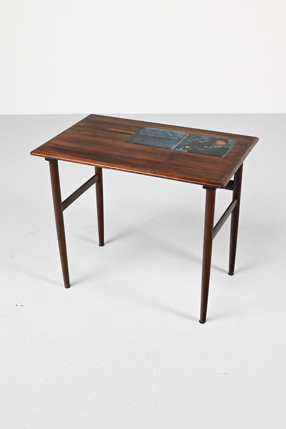 Palissander bijzettafeltje met tegels. Waarschijnlijk is dit tafeltje ooit onderdeel geweest van een set van 3. Het palissander heeft een mooie tekening van het hout en de twee keramische tegels die ingelegd zijn maken het tafeltje echt bijzonder.Wat lichte krasjes en vlekken en een reparatie aan het verbindingsstuk maar verder in een goede vintage staat.