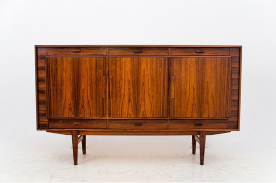Het meubel heeft zes externe laden, drie onderaan, drie bovenaan. Het geheel is gefineerd met palissanderhout.