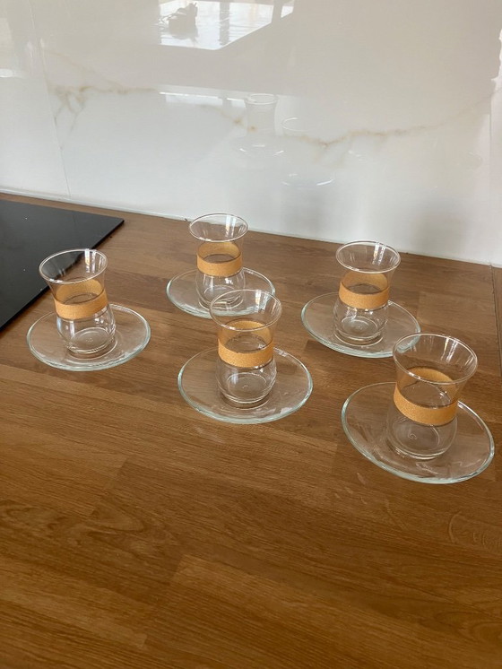 - De set bestaat uit vijf glazen met bijpassende schotels, elk voorzien van een subtiele gouden band die een vleugje luxe toevoegt.