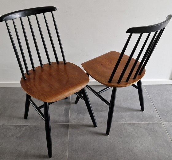 Set van twee vintage stoelen van Pastoe. De stoelen hebben een houten zitting en een zwart gelakt frame en rugleuning met spijlen. Ze verkeren in goede vintage staat met lichte gebruikssporen. Een stoel heeft twee vlekjes op zitting (zie foto).