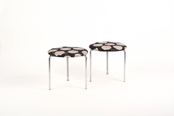 2 Pastoe grote krukken diameter 48cm. Ideaal voor op een slaapkamer naast het bed. De krukken zijn opnieuw gestoffeerd met originele katoenen Jean Paul Gaultier stof. De krukken zijn gemerkt Pastoe. Verchroomde poten.