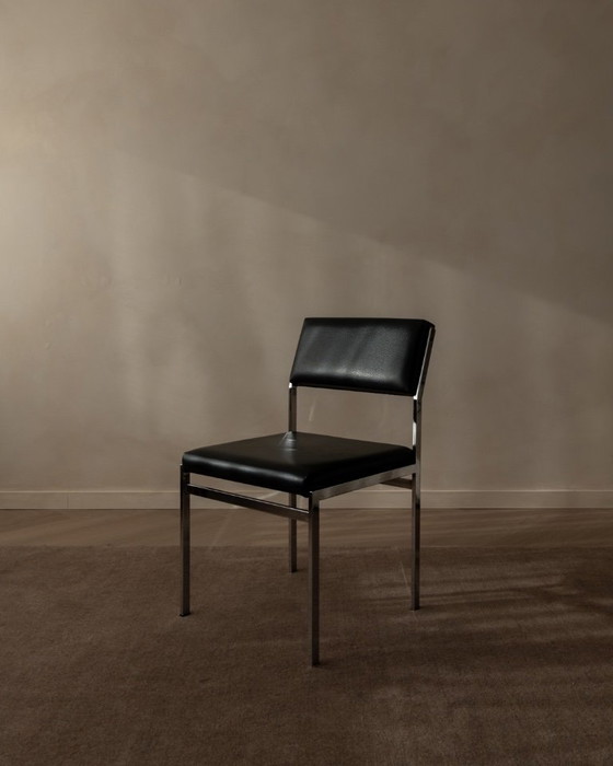 In tegenstelling tot de meer massieve stoelen uit het midden van de vorige eeuw, behouden deze stoelen een lichte visuele impact, ideaal voor compacte eetruimtes of een strakke studio/kantooromgeving. De originele verchroomde frames hebben een authentieke vintage patina ontwikkeld, een doorleefd karakter dat verzamelaars waarderen omdat het authentieke stukken uit die periode onderscheidt van moderne reproducties. Afgewerkt met zwart origineel kunstleer, hebben ze een strakke, monochrome en tijdloze uitstraling.