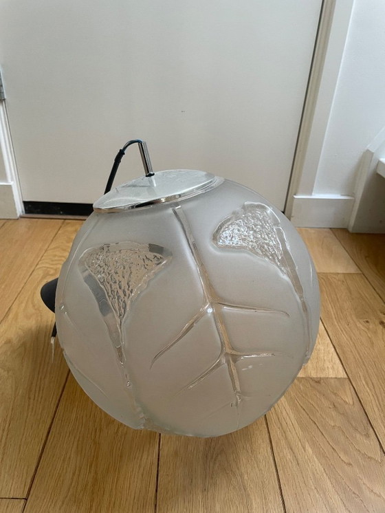 Peill & Putzler glazen/chroom hanglamp. De lamp is van prachtig dik glas met een ingelegde bladdecoratie.