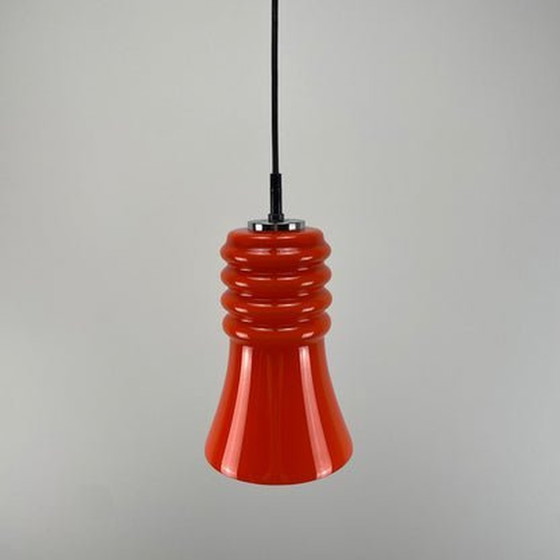 Maak je kamer mooier met deze trompetvormige hanglamp van oranje glas uit de jaren 1960! Het strakke, uitlopende ontwerp en de levendige oranje kleur maken het een echt pronkstuk voor elke retro-geïnspireerde ruimte. De trompetvorm was populair in het verlichtingsontwerp van de Mid Century, omdat het de modernistische liefde voor organische, vloeiende vormen nabootste. Peill & Putzler is een gerenommeerde Duitse glasfabrikant, beroemd om zijn hoogwaardige, kunstzinnig ontworpen verlichting en glaswerk. Het bedrijf werd opgericht in 1947 en werd halverwege de 20e eeuw bekend door het creëren van prachtige lampen, kroonluchters en decoratieve glazen voorwerpen uit de Mid Century Modern. Het merk werd vooral iconisch in de jaren 1960 en 1970, toen het innovatieve glazen verlichting produceerde die vaak geïnspireerd was door organische vormen en futuristische ontwerpen.