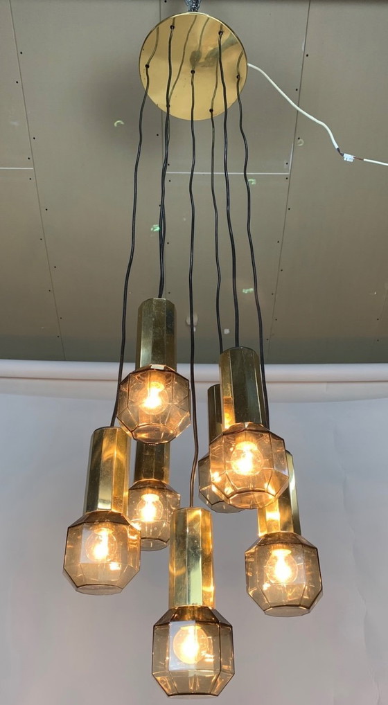 Deze elegante Staff hanglamp heeft een opvallende combinatie van goudkleurig metaal en transparant glas. Het mid-century moderne ontwerp voegt een vleugje verfijning toe aan elke ruimte. De lamp bestaat uit meerdere hangende elementen, waardoor een dynamische en opvallende uitstraling ontstaat. Perfect om een stijlvol middelpunt aan je kamer toe te voegen.