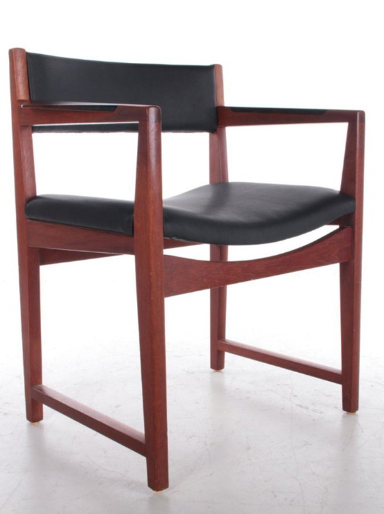 Deze fraaie armstoel is een ontwerp van Peter Hvidt en Olga Mølgaard-Nielsen, en is bekend als Model 370, gemaakt voor Søborg. Het frame van de stoel is gemaakt van teakhout en de armleuningen zijn gemaakt van palissanderhout. De stoel is opnieuw bekleed met zwart skai en verkeert in een zeer goede staat.