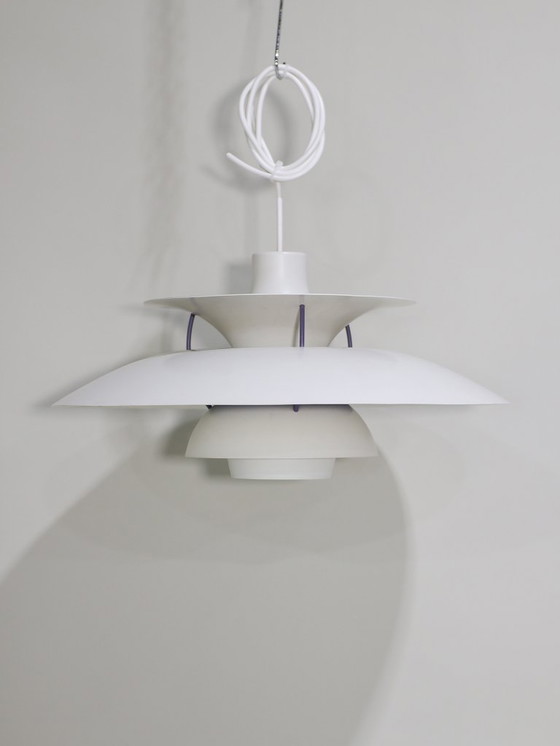 Iconische PH5 hanglamp in 1958 ontworpen door Poul Henningsen voor Louis Poulsen, Denemarken. Deze vintage lamp heeft een witte kleur met lila, blauwe en rode details. Het reflecterende meerschermensysteem zorgt voor prettig, schitteringsvrij licht, dat zich het meeste omlaag verspreidt. Ook belicht de armatuur zichzelf met een zachte, warme gloed vanuit de kern.