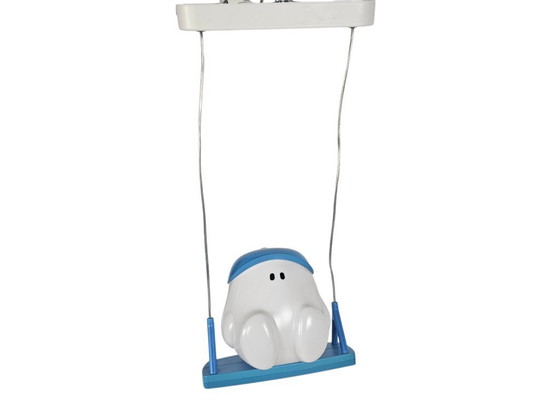 Philips myKidsRoom Buddy Swing hanglamp, een speelse lamp ontworpen voor kinderkamers. De lamp bestaat uit een klein wit figuurtje ("Buddy") met een blauwe pet, dat op een blauwe schommel zit.