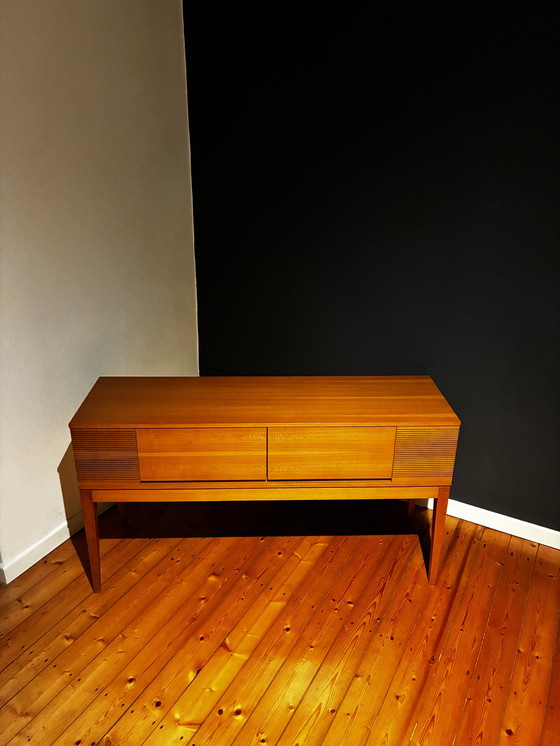 Deze prachtige Phonomöbel, ofwel platenspelerkast, is een toonbeeld van mid-century modern design. Gemaakt van rijk hout, vormen de strakke lijnen en minimalistische esthetiek een perfecte aanvulling op elke stijlvolle woonruimte.