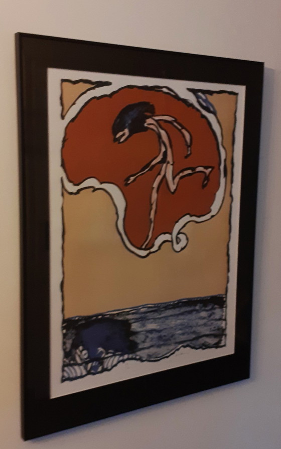 Worldly flying Object Specificaties: Kunstenaar:Pierre Alechinsky Afmeting:65 x 48 cm Maat lijst:78 x 60 cm Handgesigneerd:Ja, in de ondermarge Lijst:Prachtige zwarte stalen lijst met passepartout Datum:1977 Techniek:Litho op Vélinpapier, genummerd 14/100 Over de kunstenaar: Pierre ALECHINSKY (1927) Pierre Alechinsky is één van de belangrijkste nog levende kunstenaars. Alechinsky volgde van 1944 tot 1948 een opleiding aan de École Nationale Supérieure des Arts Visuels La Cambre in Brussel. Na het voltooien van zijn opleiding werd Alechinsky in 1949 lid van de Cobra groep (CoBrA= Copenhagen Brussel Amsterdam) en was hij de belangrijkste vertegenwoordiger van Cobra in Brussel. Alechinsky deed mee of organiseerde de belangrijke Cobra tentoonstellingen in Brussel in de begin 50er jaren. Na de Cobra periode wordt het werk van Alechinsky abstracter en meer expressionistisch, mede onder invloed van zijn verblijf in Parijs. Onder invloed van o.a. Walasse Ting werkt hij in de jaren 60 steeds meer op basis van oosterse technieken. Japanse en Chinese (kalligrafie) kunst hebben een sterke invloed op zijn werk. Het werk van Alechinsky staat hoog in aanzien, heeft internationale naam en faam en hij heeft vele tentoonstellingen in binnen- en buitenland op zijn naam staan. Onder andere een grote solotentoonstelling in Museum van Schone Kunsten in Brussel. Zijn werk bevindt zich dan ook in de collectie van de grote musea voor moderne kunst in de hele wereld.