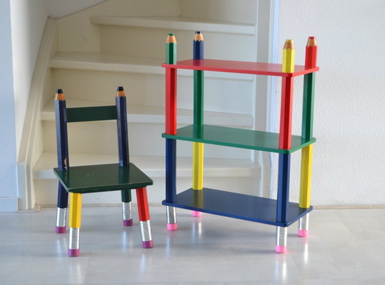 Vintage wandrek en stoel van Pierre Sala voor IKEA uit de jaren '80. Het kastje is in zeer nette staat. De stoel heeft wat meer sporen van gebruik (wat krassen en kale plekken, zie foto). Verder zijn de meubeltjes in goede staat.