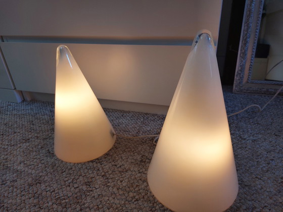 Voeg een vleugje moderne elegantie toe aan uw interieur met deze set piramidevormige lampen van het gerenommeerde merk SCE. Deze lampen, vervaardigd uit hoogwaardig glas, bieden een strakke en minimalistische uitstraling die naadloos in elke ruimte past.
