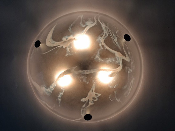 Een sferisch marble`achtig´ glazen kap van Murano op een metalen/messing armatuur