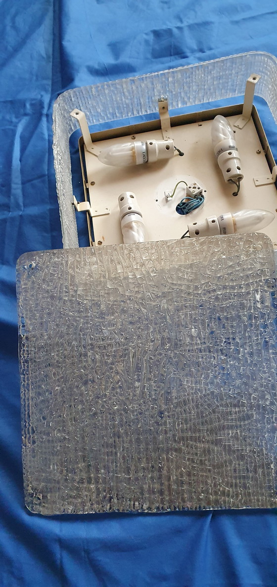De lamp meet 37 x 37 cm aan de buitenkant. Reliëfglas