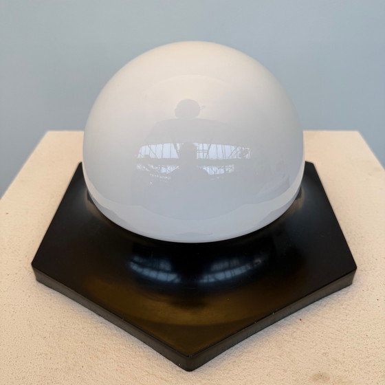 Plafond/Wandlamp Jaren 60/70 de houder van zwart kunststof is zeshoekig. De bol is van glas. We hebben deze lampen in allerlei kleuren en vormen. Uit de collectie van de zaak Design en Advies.