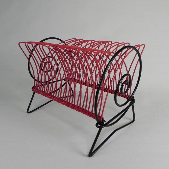 Stijlvol metalen vinylrek in rood en zwart met speelse, golvende lijnen.