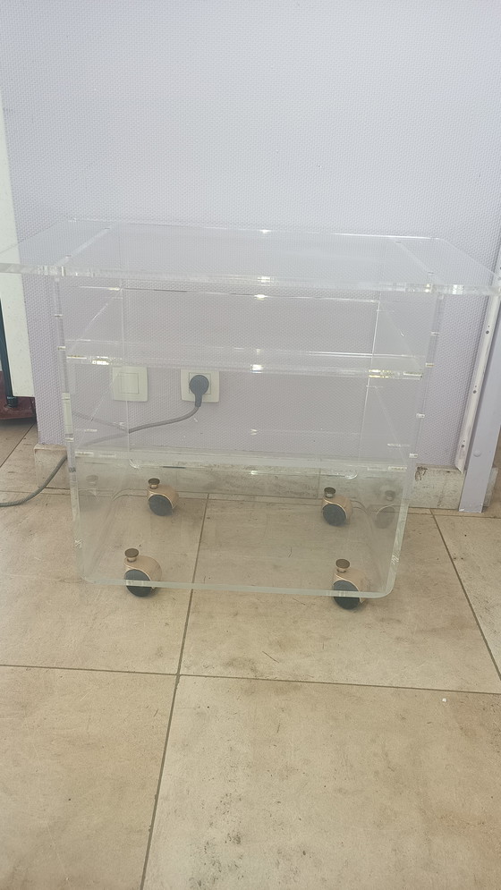 - Gemaakt van hoogwaardig plexiglas, biedt deze trolley een transparante en luchtige esthetiek die moeiteloos in elke ruimte past.