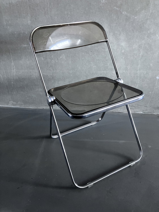 Ooit gebruikt in het voormalig Umg in Groningen, 1 x Plia klapstoel , rookplexiglas Het chroom is wat aangetast