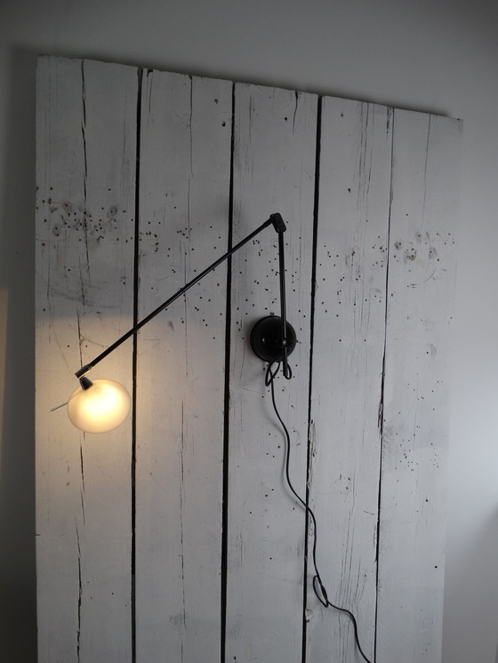 Nederland – 1970-1979 – metaal Aangeboden word een minimalistische wandlamp van Hollands fabricaat: Pola Amstelveen wandlamp uit de jaren ’70. De lamp is optimaal verstelbaar: bij de wandplaat, bij de verbinding tussen de 2 armen en bij de lampenkap. Dit maakt de afstelling van de gewenste lichtstand zeer eenvoudig. Diameter metalen lampenkapje: 12 cm. Hoogte lampenkapje: 6 cm. Armlengte: van kapje naar elleboog 55 cm, van elleboog naar wand 20/30 cm. Lichtbron: 20 watt halogeen G4 stekers. De lamp verkeert in een mooie staat, met geringe leeftijd gerelateerde gebruikssporen. Glazen lampenkap.