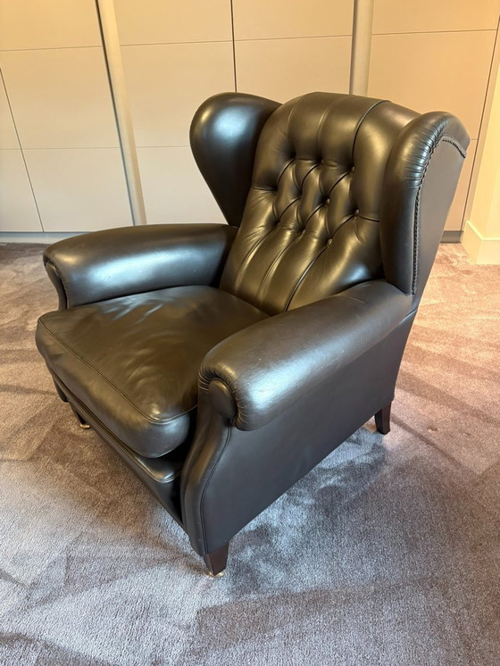 Het zitkussen is gevuld met ganzendons voor extra comfort. De bekleding is glad donkerbruin leer. De achterkant van de fauteuil is afgewerkt met een capitonné-patroon.