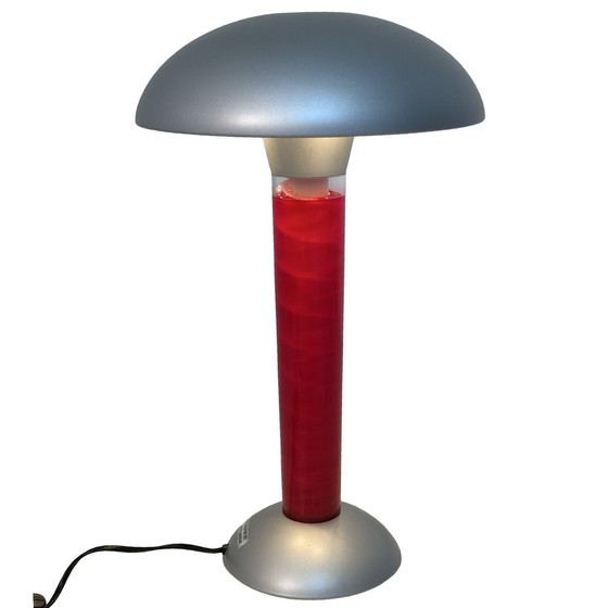 Unique lamp made with a liqued filled centre that has a motor inside so the liquid is always in motion. Giving an effect that looks like a mix between an old jukebox and a slushmachine. It’s in great condition and comes including the bulb that gives it a warm glow. The design is in the style of pop art / space age design and can been seen a somewhat of a mushroom