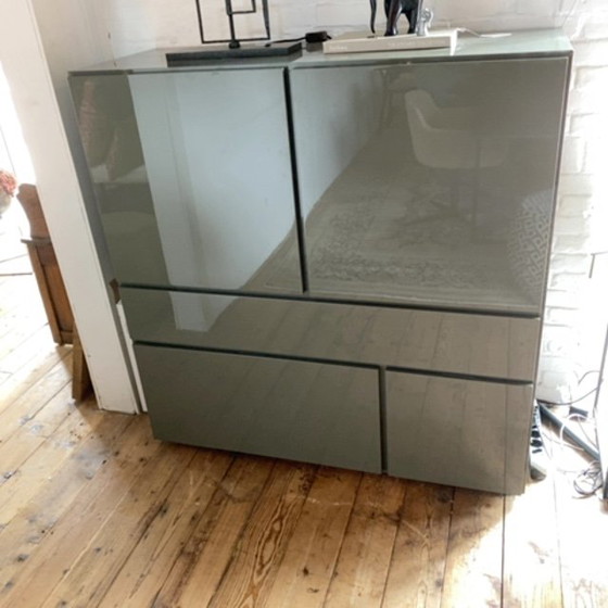 Porro Modern wandkast (glossy lacquered colour) In zeer goede staat, 1 miniscule buts aan zijkant, niet direct zichtbaar. De strakke lijnen van het ontwerp worden versterkt door het gelakte oppervlak, de gekleurde glazen details en de speelse uitstraling, waarbij de warme tint een levendige dimensie toevoegt. 4 kastjes en 1 lade. H120 x B120 x D46,5 cm