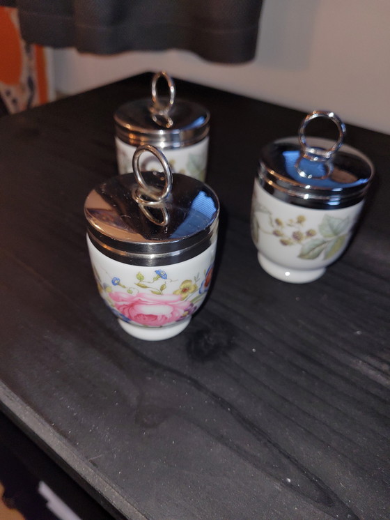 Breng een vleugje elegantie naar je ontbijt met deze prachtige set van drie Royal Worcester eierbakjes. Deze vintage eierbakjes zijn gemaakt van fijn porselein en versierd met kleurrijke bloemenmotieven, perfect om je tafel op te fleuren.