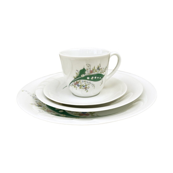 Een interessante ontbijtset geproduceerd door de "Wawel" / "Krzysztof" Tafelporseleinfabriek in Wałbrzych in de tweede helft van de 20e eeuw. De set bestaat uit een kop, schotel, klein bord en groot bord. De set is versierd met een lelietje-van-dalen sticker. Uitvergrote vierdelige ontbijtset, gesigneerd. Het item is in originele staat, vertoont normale gebruikssporen. Afmetingen: hoogte 6 cm | breedte 9 cm | diepte 11 cm dessertbord: diameter 17 cm