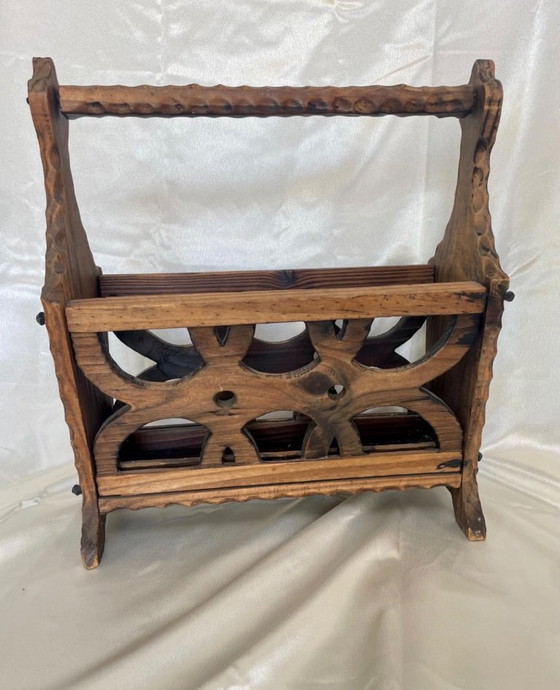 Deze prachtige vintage tijdschriftenhouder, gemaakt in Portugal in de jaren 70, belichaamt de elegantie en het vakmanschap van vervlogen tijden. Hij is gemaakt van massief hout en heeft ingewikkelde houtsnijwerken die de natuurlijke schoonheid van het materiaal benadrukken, waardoor hij een perfecte aanvulling is op elke stijlvolle woonruimte. De robuuste constructie garandeert duurzaamheid, terwijl het artistieke ontwerp een vleugje vintage charme toevoegt aan uw interieur.
