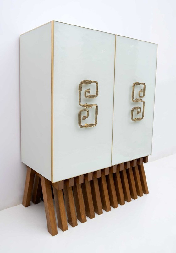 Een interessant postmodern barmeubel, dressoir/barmeubel, zeer karakteristiek Italiaans ontwerp, met twee voordeuren in melkwit Murano-glas en messing handgrepen in de stijl van Luciano Frigerio,