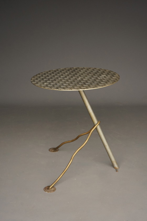 Een elegante industriële metalen bijzettafel in postmoderne stijl die doet denken aan de Memphis Group. Het eenvoudige ontwerp combineert verschillende metalen afwerkingen en vormen.