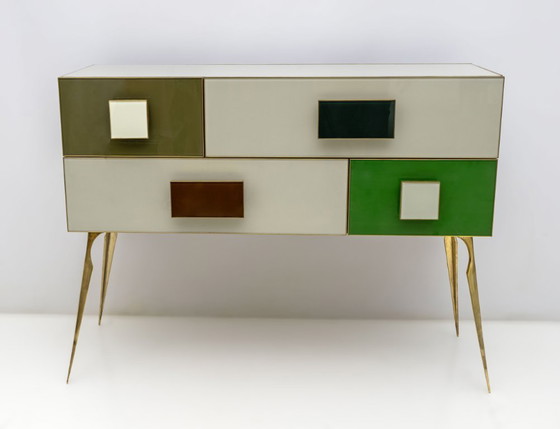 Een interessant, kleurrijk postmodern meubelstuk met een popart-tintje, een zeer leuke Italiaanse ladekast of commode met een front van 4 laden in ivoor en groen, evenals rechthoekige Bordox-glazen handgrepen in lichtgroen en donkergroen, die de roestvrijstalen afwerking van messing benadrukken. De rest van het meubilair, de bovenkanten en zijkanten, zijn van ivoorkleurig glas. De ladekast is ook aan de achterkant afgewerkt met groen gekleurd glas, zodat hij ook midden in de kamer geplaatst kan worden (zoals te zien op de foto, een klein defect onder het glas door de verf). Veel details getuigen van hoogwaardig vakmanschap.