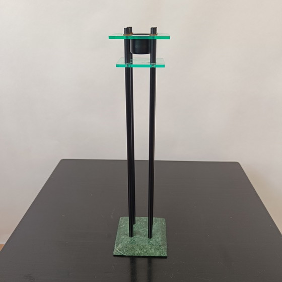 Postmoderne kandelaar – Jaren 80 Mooie kandelaar uit de jaren 80 uit Italië. Kaarshouder heeft een sierlijke vierkante groene voet van marmer met vier zwart metalen staanders, bovenaan twee acrylaat dragers en een zwart metalen kaarshouder. Dit vintage item heeft ook wat Memphis stijlinvloeden. Afmetingen: b7 x d7 x h28cm Staat: Goed met op de kunststof plaatjes wat krasjes. Let op: vraag voor uw bestemming om verzendkosten op maat! Zie voor meer vintage en design ook mijn overige advertenties. Mocht er iets tussen zitten maar wilt u het eerst komen bekijken, dan is dat uiteraard mogelijk. Neem gerust contact met mij op om een afspraak te maken. Woont u te ver weg of heeft u geen geschikt vervoer? Er zijn altijd opties om het item te laten verzenden, bezorgen of te laten bezorgen via een koeriersdienst.