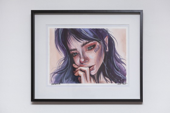 Deze prachtige aquarel van een jongedame door de Oekraïense kunstenares Jeta Wolf. Het gaat hier om een origineel en uniek werk met passepartout en lijst.