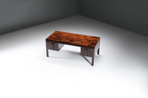 Dit prachtige en zeldzame vintage bureau, ontworpen door Jean Gillon en vervaardigd door Italma Woodart in Brazilië in 1965, is een voorbeeld van de elegantie en het vakmanschap die kenmerkend zijn voor Mid Century Braziliaanse meubels. Dit bureau is gemaakt van massief palissander en heeft een sculpturale en verfijnde structuur die esthetiek en functionaliteit naadloos combineert. Ontworpen door Jean Gillon voor Italma in 1970. Italma, het merk dat geassocieerd wordt met Gillon, verwijst naar een ontwerpstudio die hij oprichtte en die bekend werd door het produceren van handgemaakte stukken van hoge kwaliteit. Door zijn werk voor Italma vestigde Gillon zijn reputatie als sleutelfiguur in de designwereld in het midden van de 20e eeuw. Een van zijn kenmerkende bijdragen was zijn benadering van het ontwerpen van functionele maar mooie meubels, het creëren van stukken die zowel artistiek als praktisch waren. De ontwerpen van Gillon worden gekenmerkt door hun organische vormen, eenvoud en doordachte integratie van materialen, vaak geïnspireerd door de natuurlijke wereld. Zijn werk staat hoog aangeschreven in de designgemeenschap en zijn meubels worden vandaag de dag nog steeds verzameld door musea en designliefhebbers. Conditie : Dit prachtige bureau heeft een fascinerende patina en is ondanks zijn leeftijd in een goede conditie, met normale gebruikssporen. De onderste lade heeft een kleine reparatie ondergaan. Afmetingen : b180 x d85 x h77cm