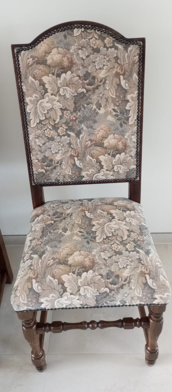 Deze prachtige set van zes eiken eetkamerstoelen straalt klassieke elegantie uit en is een perfecte aanvulling voor elke eetkamer. De stoelen zijn vervaardigd uit hoogwaardig eikenhout, wat zorgt voor duurzaamheid en een tijdloze uitstraling. De bekleding is voorzien van een verfijnd bloemenpatroon in zachte tinten, wat een vleugje charme toevoegt aan het geheel.