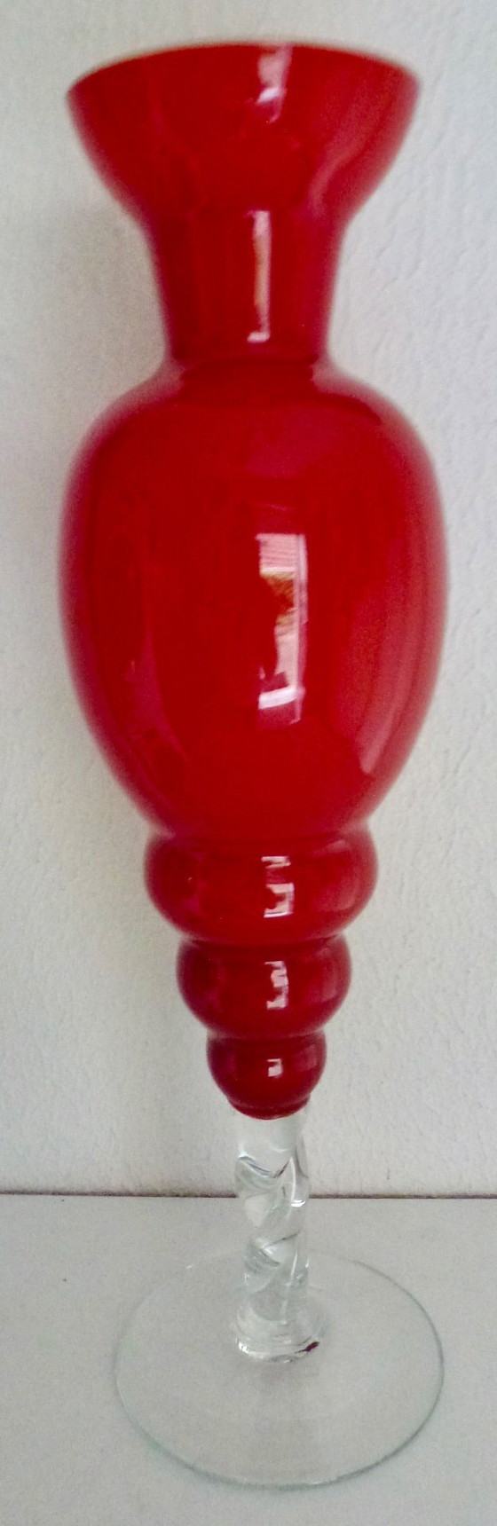 Kenmerkend is de levendige, handgeblazen rode kleur, de bolle vorm en vooral de gedraaide, transparante glazen voet, die zorgt voor een verfijnde uitstraling.