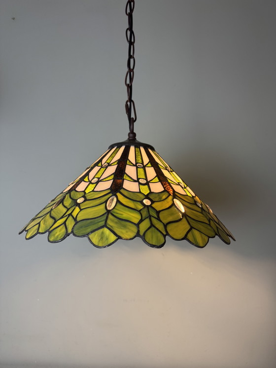 Verlicht uw ruimte met elegantie en charme met deze prachtige hanglamp van gebrandschilderd glas in Tiffany-stijl. Deze gloednieuwe lamp, geleverd in de originele doos, is een waar meesterwerk van vakmanschap. De levendige groene en beige tinten creëren een warme en uitnodigende sfeer, perfect voor elk interieur. Met een ophanghoogte van circa 95 cm, een hoogte van 24 cm en een diameter van 41 cm is deze lamp een unieke aanwinst voor uw inrichting.