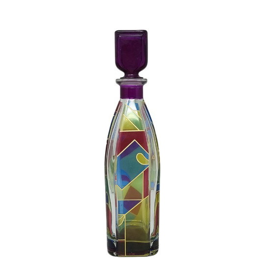 Prachtige karaf of decoratieve fles uit de jaren 70, gekleurd in kristal door Luigi Bormioli. Het heeft een zeer geometrisch ontwerp en prachtige kleuren. Gemaakt in Italië. In uitstekende staat.